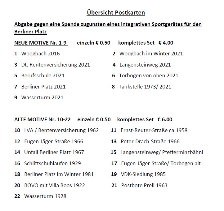 Es können komplette Sets für 4 € oder 6 € (siehe Preisliste unten) gekauft werden, die Postkarten sind aber auch einzeln für 0.50 € erhältlich. Natürlich darf auch gerne mehr dafür bezahlt werden, denn jede Spende geht zugunsten eines integrativen Spielgerätes auf dem Berliner Platz.
