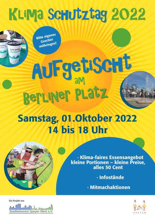 der Stadtteilverein Speyer-West e. V. bietet in Kooperation mit der Stadt Speyer am 01.10.22 von 14 bis 18 Uhr wieder einen Klimaschutztag auf dem Berliner Platz an.