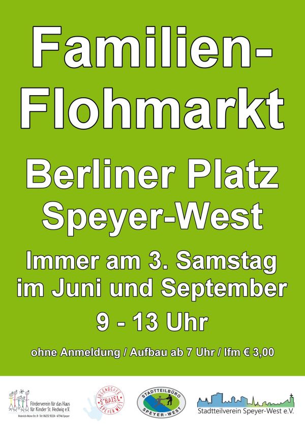 Endlich ist es wieder soweit – der Stadtteilverein Speyer-West e. V. veranstaltet gemeinsam mit dem Förderverein für das Haus für Kinder St. Hedwig/Jugendcafé Speyer- West am Samstag, 17.06.2023 den beliebten Familien-Flohmarkt auf dem Berliner Platz in Speyer West.