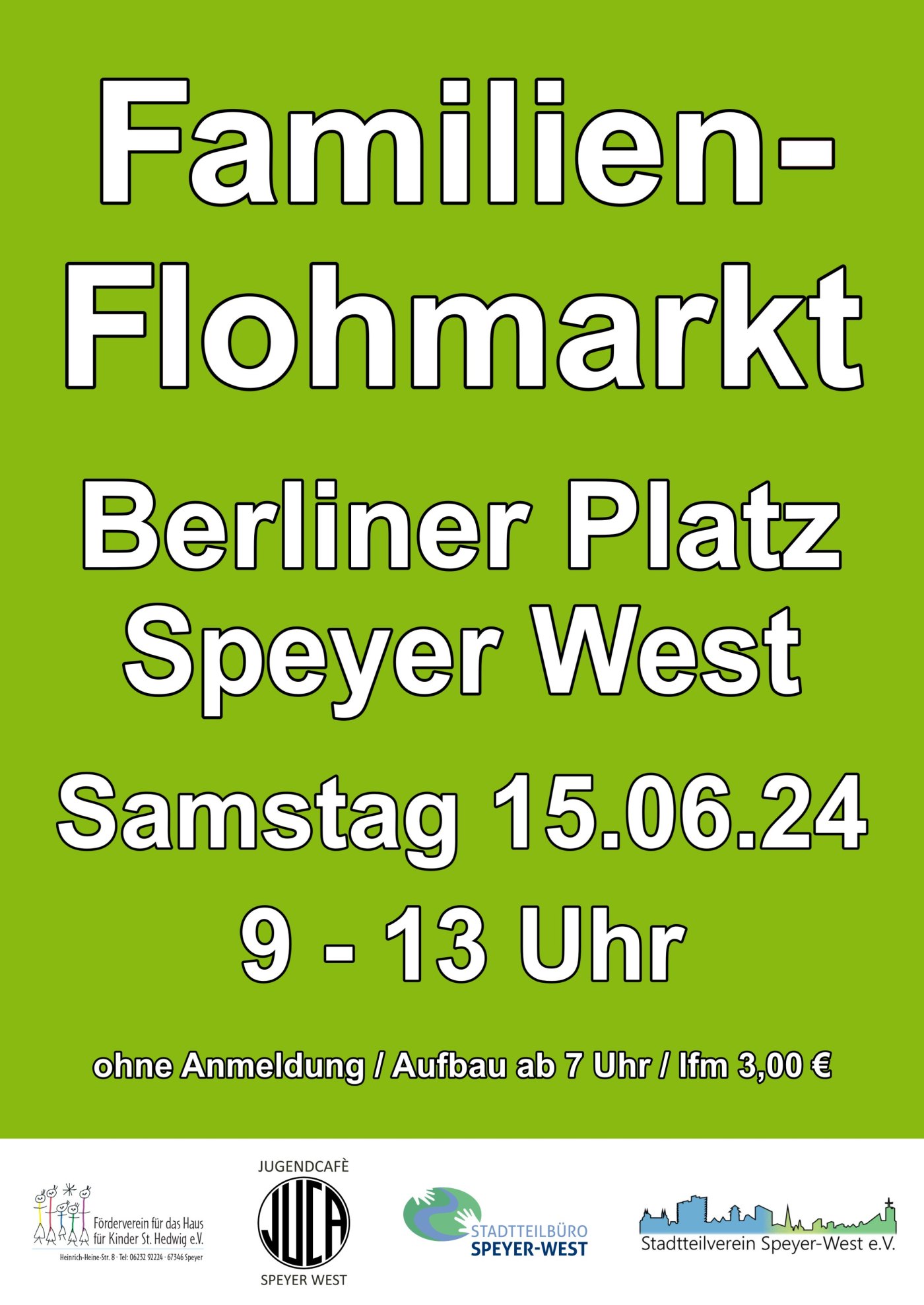 Der Stadtteilverein Speyer-West e. V. veranstaltet gemeinsam mit dem Förderverein für das Haus für Kinder St. Hedwig/Jugendcafé Speyer- West am Samstag, 15.06.2024 den beliebten Familien-Flohmarkt auf dem Berliner Platz in Speyer West.