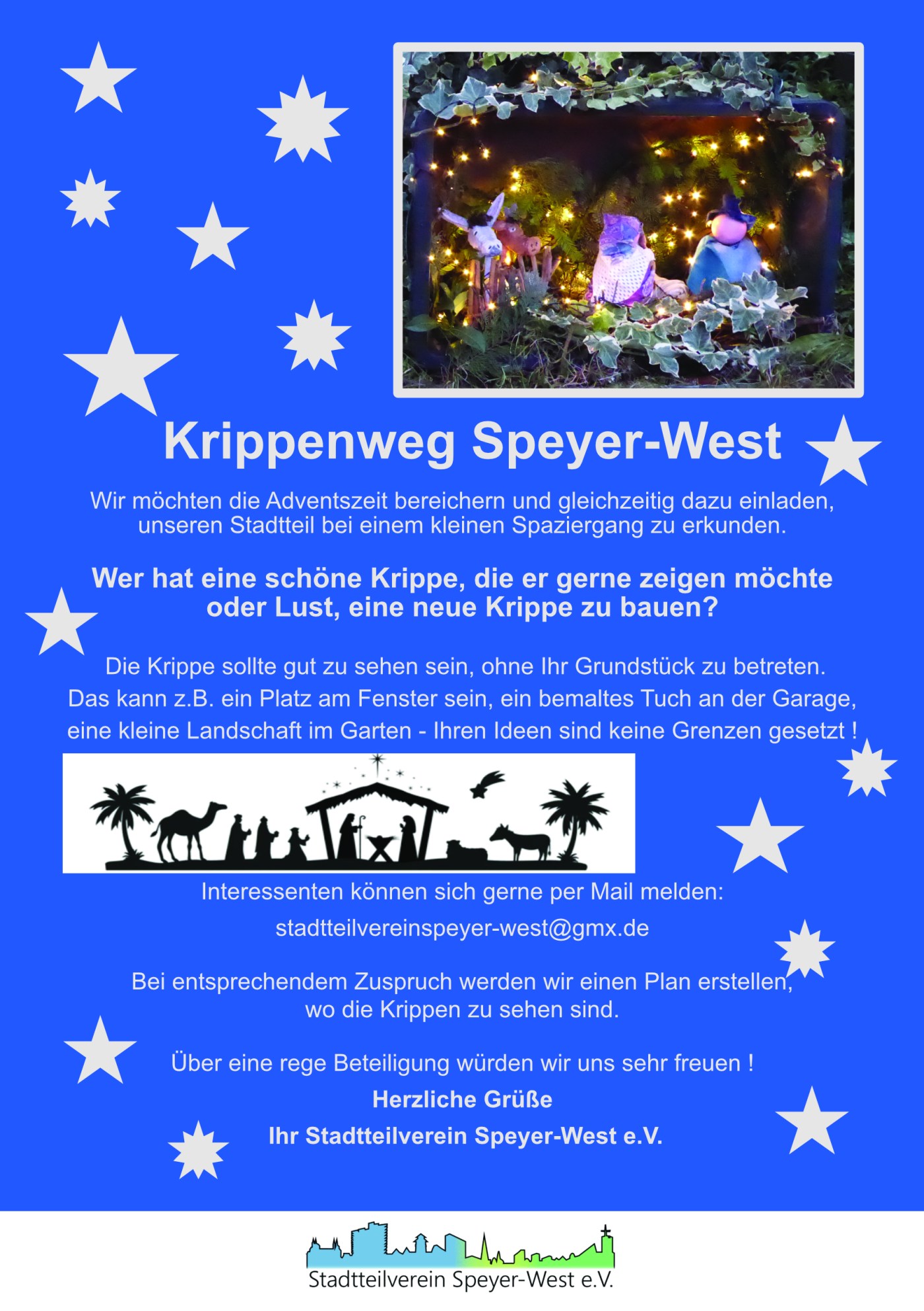 2023 haben wir den Versuch gestartet, einen Krippenweg in unserem Stadtteil aufzubauen. Die Resonanz war gut, deshalb möchten wir daran anknüpfen und freuen uns über Alle, die sich beteiligen! Wir sind schon sehr gespannt, was Sie alles zu bieten haben und wo dann Krippen zu sehen sein werden.
